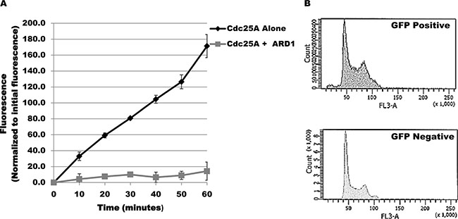Figure 5: Cdc25A acetylation modulates its phosphatase activity. (A) ARD1 induces a reduction in Cdc25A phosphatase activity. Phosphatase activity was measured spectrophotometrically based on Cdc25A catalysis of 6, 8-difluoro-4-methylumbelliferyl phosphate (DiFMUP) hydrolysis to 6, 8-difluoro-4-methylumbelliferone. Cdc25A phosphatase activity was measured in the absence or presence of ARD1. (B) Cdc25A acetylation is associated with accumulation of cells in the S and G2/M phases of the cell cycle. Cell cycle profiles of untransfected cells (GFP negative) or cells overexpressing GFP-ARD1A (GFP Positive) were compared by flow cytometry.