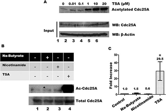 Figure 6: Influence of HDACs and Sirtuins in Cdc25A acetylation levels. (A) HEK 293T cells were incubated with increasing concentrations of TSA for 4 h. Cdc25A was immunoprecipitated from cell lysates and the immunoprecipitates were subjected to SDS-PAGE and western blotting with anti-acetyl lysine antibody (upper panel). Each cell lysates (100 μg) was analyzed by Western blotting with anti-Cdc25A antibody. (B) HEK 293T cells were treated with or without 10 mM Sodium-Butyrate, 5 mM Nicotinamide, and/or 10 μM TSA for 4 h. Cell lysates were subjected to immunoprecipitation with antibody to Cdc25A and immunoprecipitates were subjected to SDS-PAGE and western blotting with anti-acetylated lysine antibody. (C) Quantification for Cdc25A acetylation (mean ± SD of 3 independent experiments. * = P < 0.05 when compared with control untreated cells).