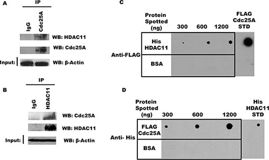 Figure 7: Cdc25A interacts directly with HDAC11. (A) and (B) Interaction between endogenous Cdc25A and HDAC11. Cdc25A (A) or HDAC11 (B) was immunoprecipitated from HEK 293T cell lysates. Immunoprecipitates were subjected to SDS-PAGE and probed with anti-HDAC11 and anti-Cdc25A antibodies. (C) Cdc25A binds directly to HDAC11. Purified His-HDAC11 and BSA (control) were immobilized on nitrocellulose membrane at the indicated concentrations and subsequently incubated in buffer containing FLAG-Cdc25A (800 ng). Cdc25A bound to His-HDAC11 was detected using anti-FLAG antibodies. (D) HDAC11 binds directly to Cdc25A. The reciprocal experiment used purified FLAG-Cdc25A and BSA immobilized on a nitrocellulose membrane which was incubated in buffer containing His-HDAC11 (800 ng). Bound His-HDAC11 was detected using anti-His antibodies.