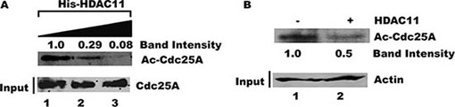 Figure 8: Acetylated Cdc25A is a substrate for deacetylation by HDAC11. (A) HDAC11 mediates Cdc25A deacetylation in vitro. Purified His-Cdc25A was incubated with increasing amounts of purified HDAC11. The reactions were analyzed using antibody to acetylated lysine followed by chemiluminescent detection. (B) Endogenous Cdc25A is deacetylated by HDAC11. Cdc25A was immunoprecipitated from HEK 293T cell lysates and then incubated with or without HDAC11. The enzyme’s acetylation status was analyzed by western blot using an acetyl-specific antibody.