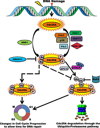 Disruption of Cdc25A function during tumor formation due to altered Cdc25A acetylation might impair the ability of cells to control cell cycle checkpoints and thereby increase genomic instability. This notion would be consistent with Cdc25A dysregulation seen in several cancer types. Alternatively, loss of function or dysregulation of ARD1 and HDAC11 that disrupt steady state Cdc25A acetylation might also explain aberrant Cdc25A levels in those cancers. Although much regarding Cdc25A acetylation remains unresolved, our data provide new mechanistic insights into the role of Cdc25A acetylation in cell cycle regulation following genomic insult and in cancer.