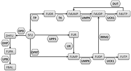 5-FU: 5-fluorouracil; 5-FUDR: 5-FU degradation rate (expressed as ng 5-FU/ml/106 cells/min); CI: confidence interval; CRC: colorectal cancer; CTC3: National Cancer Institute Common Toxicity Criteria, version 3; DHFU: 5, 6-dihydrofluorouracil; DHP: dihydropyrimidinase; DPD: dihydropyrimidine dehydrogenase; DUT: dTUPase; FBAL: α-fluoro-β-alanine; FdUDP: fluorodeoxyuridine diphosphate; FdUMP: fluorodeoxyuridine monophosphate; FdUTP: fluorodeoxyuridine triphosphate; FUDP: fluorouridine diphosphate; FUDR: 5-fluoro-2′-deoxyuridine; FUMP: fluoroyuridine monophosphate; FUPA: α-fluoro-β-ureidopropionic acid;