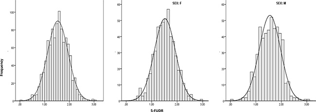 Figure 2: 5-FU degradation rate distribution (n = 1010; n = 518, females; n = 492, males).