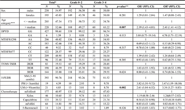 Table 2: Association of severe toxicity (CTC3 Grade 3-4) with demographic, genotype, 5-FU degradation rate (5-FUDR) and chemotherapy characteristics, in the sample of colorectal cancer patients (N = 433) by univariate and multivariate analyses