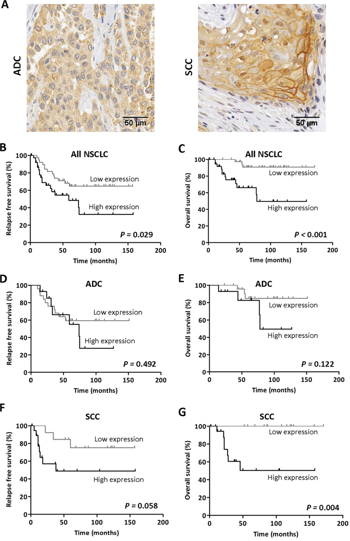 Regarding prognosis, patients with high levels of TMPRSS4 showed significantly shorter relapse free survival (RFS, p=0.029) and overall survival (OS, p<0.001) than those with low levels (Figure 1B-1C). We next stratified the patients according to their histological tumor type. In ADC patients, no statistical association was found between TMPRSS4 levels and either RFS (p=0.492) or OS (p=0.122) (Figure 1D-1E). On the contrary, in SCC patients, high TMPRSS4 levels were significantly associated with reduced OS (p=0.004) and were close to statistical significance for RFS (p=0.058) (Figure 1F-1G).