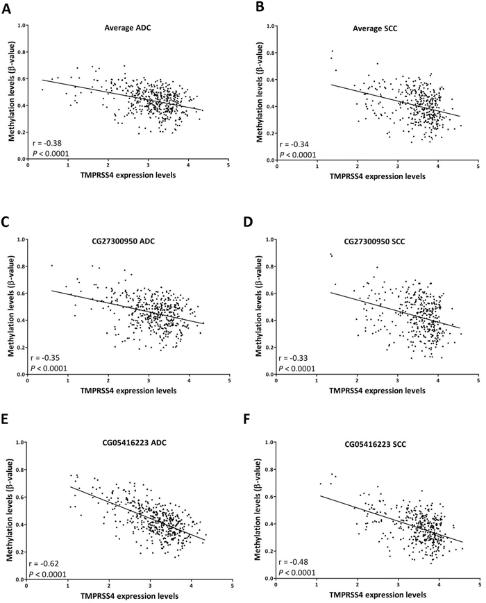 Figure 4A-4B shows a significant inverse correlation between TMPRSS4 expression and methylation status for the average value of the 4 probes analyzed (r=-0.38, p<0.0001 for ADC; r=-0.34, p<0.0001 for SCC). A significant inverse correlation between expression and methylation status considering separately each of the individual probes was also observed (p<0.0001 for all of them). Figure 4C-4F shows the probes with the highest correlation values: CG27300950 (r=-0.35 for ADC; r=-033 for SCC; Figure 4C-4D) and CG05416223 (r=-0.62 for ADC; r=-048 for SCC; Figure 4E-4F).