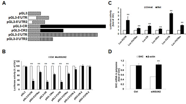 Next, we asked if methylation by NSUN2 influences SHC expression levels. To this end, we first constructed a series of pGL3-derived reporters (Figure 4A, schematic) and tested the activity of these reporters in HeLa cells with silenced NSUN2. As shown in Figure 4B knockdown of NSUN2 reduced significantly the activity of these reporters (p<0.01). As controls, knockdown of NSUN2 could not alter significantly the activity of pGL3, pGL3-5’UTR2, pGL3-CR2, and pGL3-3’UTR2. Notably, the effect of NSUN2 knockdown in altering the luciferase activity from pGL3-5’UTRm, pGL3-CRm, and pGL3-3’UTRm was less effective, but not lost, in keeping with the results shown in Figure 3B. In sum, methylation by NSUN2 enhances SHC expression.