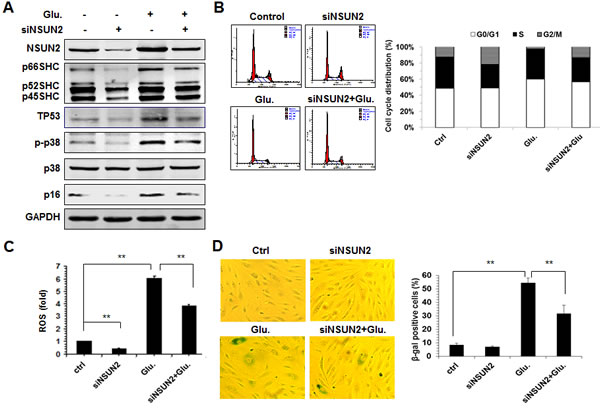 Figure 6: The NSUN2-mediated regulation of SHC impacts on high glucose-induced cellular senescence. A. HUVECs were transfected with an NSUN2 siRNA or a control siRNA. Twenty-four h later, cells were exposed to glucose (33 mM) and cultured for an additional 48 h. Cell lysates were prepared and subjected to Western blot analysis to assess the protein levels of p66SHC, p52SHC, p46SHC, p38, p-p38, p16, TP53 and GAPDH. B. Cells described in Figure 6A were subjected to FACS analysis. Data are representative from 3 independent experiments. C. Cellular ROS levels in cells described in Figure 6A were analyzed. Data shown are the mean ± SD from 3 independent experiments and statistical significance was analyzed by Student’s t test (**, p < 0.01). D. Cells described in Figure 6A were subjected to SA-β-gal analysis. Data represent the mean ± SD from 3 independent experiments and statistical significance was analyzed by Student’s t test (**, p < 0.01).