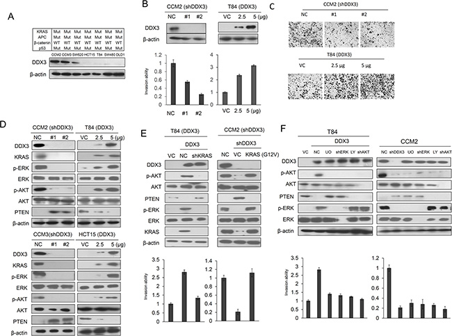 Figure 1: DDX3 promotes cell invasion via the KRAS/ERK/PTEN/AKT cascade. (A) Seven colon cancer cell lines were enrolled to evaluate the expression levels of DDX3 by western blotting. (B) Two kinds of DDX3 shRNA were transfected into high DDX3 expressing CCM2 cells. Two doses of DDX3 expression vector were transfected into low DDX3 expressing T84 cells. After 48 hr, the lysates were harvested and evaluated for levels of DDX3 and β-actin protein by Western blotting. The invasion capability were evaluated in CCM2 cells with or without shDDX3 transfection and in T84 cells with or without DDX3 expression vector transfection and the efficacy of invasion ability were compared with NC and VC. (C) Representative invasive cells are shown on Matrigel membranes. (D) The expression of KRAS, p-ERK, p-AKT, ERK, AKT and PTEN in DDX3-knockdown CCM2 and CCM3 cells and DDX3-overexpression T84 and HCT15 cells were evaluated by western blotting. (E) T84 cells were transfected with indicated combination of DDX3 expression vector and KRAS shRNA for 24 hr. CCM2 cells were transfected with indicated combination of DDX3 shRNA, mutant KRAS (G12V) for 24 hr. The invasion capability was evaluated by Boyden chamber assay for additional 16 hr. The expression of DDX3, KRAS, p-ERK, p-AKT, ERK, AKT and PTEN was determined by Western blotting. (F) T84 cells were transfected with indicated combination of DDX3 expression vector, ERK shRNA and AKT shRNA for 24 hr. CCM2 cells were transfected with DDX3, ERK and AKT shRNA for 24 h. After 24 hr, these cells were treated with or without 10 μM LY294002 and U0126 for 5 hr. The invasion capability was evaluated by Boyden chamber assay for additional 16 hr.