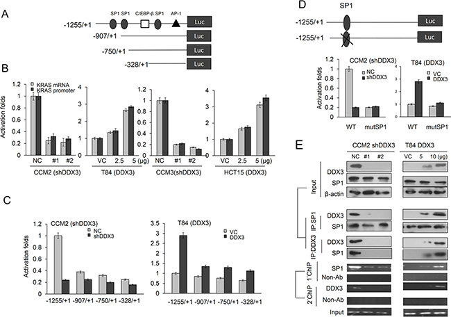 Figure 2: DDX3 enhances KRAS transcription via increased SP1 binding to the KRAS promoter. (A) Schematic diagram of KRAS-promoter-driven luciferase reporters: KRAS (–1255/+1)-Luc, KRAS (–907/+1)-Luc, KRAS (–750/+1)-Luc, and KRAS (–328/+1)-Luc. (B) KRAS mRNA and promoter (–1255/+1) activity in DDX3-knockdown CCM2 and CCM3 cells and DDX3-overexpression in T84 and HCT15 cells was evaluated by real-time PCR and luciferase reporter activity assay. (C) The KRAS promoter constructs and shDDX3 or its expression vector was co-transfected into the indicated cell types. Luciferase reporter activity was measured at 48 hr after post-transfection. (D) Schematic diagram of KRAS-promoter-driven luciferase reporters (–1255/+1) and mutated construct of SP1 binding site. The two KRAS promoter constructs and shDDX3 or its expression vector were co-transfected into the indicated cell types. Luciferase reporter activity was measured at 48 hr after post-transfection. (E) CCM2 cells transfected with two kinds of shDDX3 and T84 cells were transfected with DDX3expression vector for 48 hr. Both cell lysates were immunoprecipitated with anti-SP1-conjugated beads. The immunoprecipitates were analyzed by SDS–PAGE, followed by immunoblotting with anti-DDX3 antibody. The reciprocal experiment was performed using the anti-DDX3 antibody for immunoprecipitations followed by western blot with anti-SP1. The input control was 30% of the cell extract without any treatment. Binding activity of SP1 to the KRAS promoter was evaluated by ChIP. Chromatin was isolated and immunoprecipitated with an antibody specific for SP1. For ChIP-reChIP assays, crosslinked protein–DNA complexes were eluted from primary immunoprecipitates by incubation with 10 mM dithiothreitol for 30 min at 37°C. The eluates were diluted 1:50 in dilution buffer and then subjected to immunoprecipitation with the secondary antibodies.