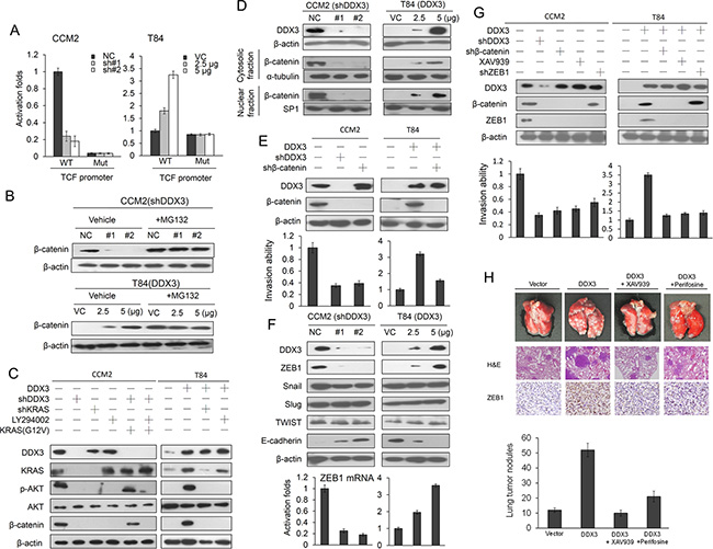 Figure 3: DDX3-mediated β-catenin activation is responsible for cell invasion via increasing ZEB1 expression. (A) The TCF promoter activity (TOP flash, WT and FOP flash, Mut) in DDX3-knockdown in CCM2 cells and DDX3-overexpressing T84 cells was evaluated by luciferase reporter assay. (B) CCM2 and T84 cells were transfected with two kinds of DDX3 shRNA and two doses of DDX3 expression vector. These cells were incubated with 5 μM of MG132 for an additional 5 hr, and then the cell lysates were analyzed by SDS-PAGE, followed by immunoblotting with anti-β-catenin antibody. (C) CCM2 cells were co-transfected with the indicated combinations of shDDX3, shKRAS and mutant KRAS (G12V) for 24 hr. T84 cells were co-transfected with the indicated combinations of DDX3 and shKRAS Consequent, these cells were treated with or without 10 μM LY294002. After treatment for 4 hr, the cells lysates were separated by SDS-PAGE for the protein expression using western blotting. (D) CCM2 and T84 cells were transfected with DDX3 shRNA and its expression vector for 48 hr. These cells were separated with cytosolic and nuclear fraction to evaluate β-catenin protein expression by SDS-PAGE using a western blotting. (E) CCM2 cells were transfected with shDDX3 or shβ-catenin for 24 hr. T84 cells were transfected with DDX3 expression vector or combined with shβ-catenin transfection for 24 hr. The expression of DDX3 and β-catenin in these treated both cells were evaluated by western blotting and the invasion capability was determined by Boyden chamber assay. The efficacy of invasion ability was compared with NC and VC, respectively. (F) Two kinds of shDDX3 were transfected into high DDX3 expressing CCM2 cells and two doses of DDX3 expression vector were transfected into low DDX3 expressing T84 cells. After 48 hr, the cell lysates were used for evaluating the expression of DDX3, ZEB1, Snail, Slug, and TWIST by Western blotting. ZEB1 mRNA expression was evaluated by real-time PCR. (G) CCM2 cells were transfected with shDDX3, shβ-catenin, shZEB1 and β-catenin inhibitor (XAV939) singly or in combination, for 24 hr. T84 cells were transfected with DDX3 expression vector, β-catenin, ZEB1-knockdown plasmids, and β-catenin inhibitor (XAV939) singly or in combination, for 24 hr. The invasion capability in both cells with different treatments were evaluated by Boyden chamber assay for 16 hr. (H) Example of lungs of mice with visual lung tumor nodules at 6 weeks after tail vein inoculation of indicated cells. Representative Hematoxylin and Eosin staining was presented in lung tumor nodules from each group of mice. The number of lung tumor nodules of each group of mice. Data are presented as mean ± SD. ZEB1 expressions in lung tumors were evaluated by IHC using a specific antibody.