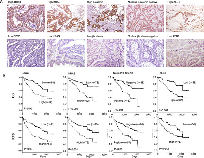 Figure 4: The representative immunostaining results of DDX3, KRAS, β-catenin expression in nucleus/cytoplasm, and nuclear β-catenin in colorectal tumors and the prognostic value of these molecules on OS and RFS was assessed using a Kaplan-Meier analysis. (A) The representative immunostaining results of DDX3, KRAS, ZEB1, β-catenin, and nuclear β-catenin in colorectal tumors; (B) The survival curves in colorectal patients with high-DDX3, high-KRAS, positive nuclear β-catenin tumors and high-ZEB1 for OS and RFS were compared to those with low-DDX3, low-KRAS, negative nuclear β-catenin, and low-ZEB1 tumors.