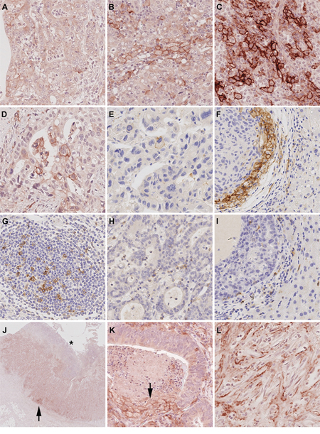 Figure 1: PD-L1 and PD-1 expression in gastric cancer and liver metastases. The entire gastric cancer (GC) cohort was screened and three representative cases were selected as reference slides for PD-L1 1+ A. 2+ B. and 3+ C. PD-L1 expression was observed in primary GCs D. and its corresponding liver metastases E. Microsatellite instable GCs often showed an increased PD-L1 expression at the interface between tumor and non-neoplastic tissue, which could also be observed in GC liver metastases F. PD-1 positive lymphocytes were present in the majority of intratumoral lymph follicles G. PD-1 expression in diffuse tumor infiltrating lymphocytes (TILs; H.) correlated significantly with patient survival and was also observed in liver metastases I. PD-L1 positive tumor cells were close to the tumor surface (distance <2.5 mm, equivalent of an average biopsy forceps) and generally attainable by endoscopic biopsy 66.9%. However, in 39 cases (33.1%), PD-L1 positive tumor cells were localized only in the tumor center (J.; arrow head; the asterisk marks the mucosal surface) or near the invasion front. Necrotic tumor cells were found to show strong membranous PD-L1-expression (K.; arrow). PD-L1 positive stroma cells (L.) Original magnifications 2-fold J. and 400-fold (A-I., K-L.).