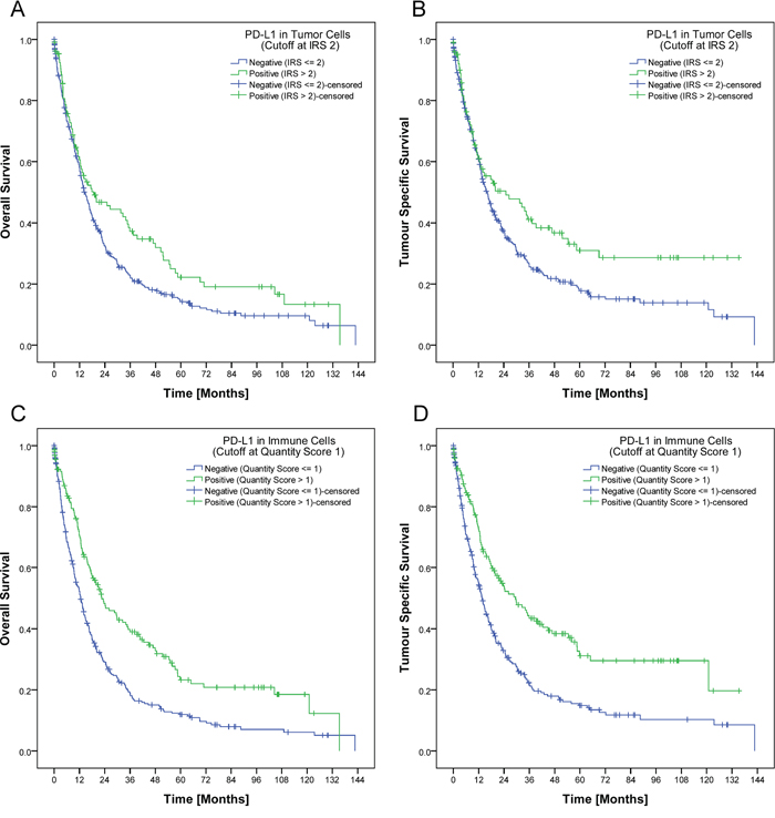Accurate interpretation of immunohistochemical stains is crucial for the establishment of a valid, histology-based predictive biomarker. Although we aimed for the HistoScore, we recognized that the overall percentage of PD-L1-positive tumor cells was low and the assessment of different percentages of three different staining intensities was indiscernible and impractical. Applying our simplified IRS, we next used patient survival as surrogate marker for biological relevance. Interestingly, while dichotomization into completely negative and any positive staining of tumor cells did not show a significant correlation with patient survival (Supplementary File 2), dichotomization into PD-L1 IRS ≤1 and >2 correlated significantly with patient survival (Figure 2). Thus, minimal expression of PD-L1 may have no effect on tumor biology. Similarly, only the presence of PD-1 positive diffusely distributed TILs, and not intratumoral lymph follicles, correlated significantly with patient survival. Based on our findings we suggest that a putative, PD-L1/PD-1-based immunohistochemical predictive biomarker score should not only explore tumor cells but also intratumoral immune cells.