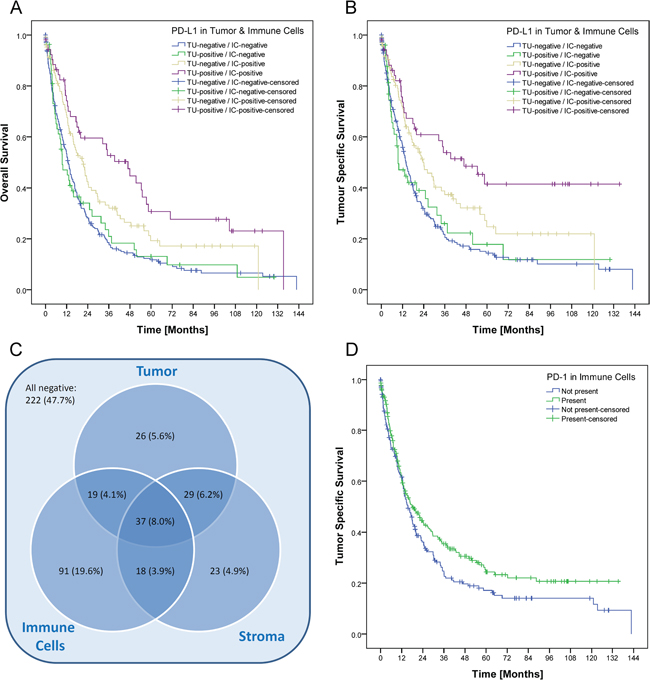 Figure 3: Prognostic significance and intersection of PD-L1 expression in tumor, immune and stromal cells. The best overall A. and tumor specific survival B. was observed for those patients with a high PD-L1 expression in tumor cells and in immune cells (p<0.001 each). After grouping and dichotomization, 243 of 465 cases (52.3%) were classified as “PD-L1 positive” for at least one tumor component (tumor cells, stroma cells and/or immune cells; C.). Expression in tumor cells, stroma cells and immune cells were significantly correlated with each other (p<0.001 each). Patients with PD-1 positive TILs showed a better tumor specific survival, which was not significant after Simes’ multiple testing procedure (p=0.050; D.).