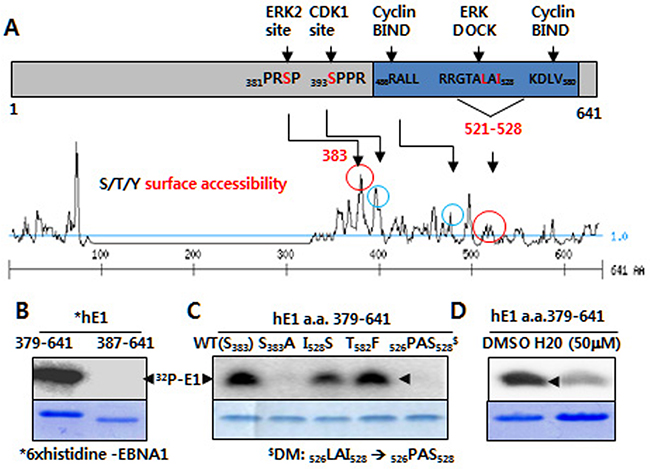 Figure 1: ERK2-directed phosphorylation of EBNA1 S383 in vitro. A. Putative ERK and CDK1 phosphorylation and bindings sites (circled) on EBNA1, as predicted by kinase surface accessibility plots. B. In vitro kinase assay reveals ERK2 catalytic activity in the presence of 6× histidine-tagged EBNA1 (hE1) a.a. 379-641, but not hE1 a. a. 387-641. Coomassie blue staining shows EBNA1 levels. C. Absence of ERK2-directed phosphorylation on hE1 S383A and 526PAS528 double mutant (DM), reduced phosphorylation on I528S mutant. D. H20 inhibits ERK-mediated EBNA1 phosphorylation.
