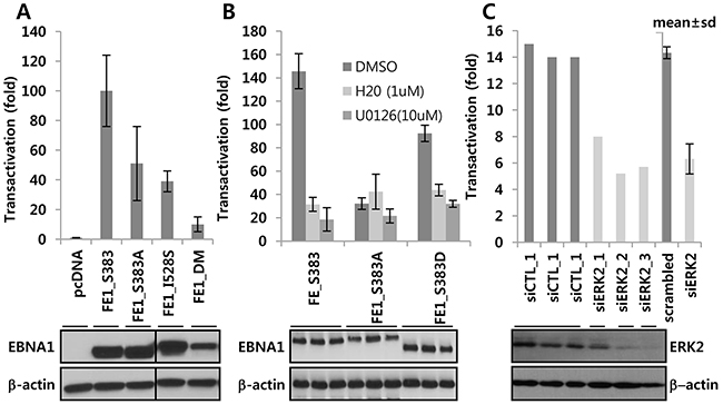 FLAG-EBNA1 (FE1), enhanced green fluorescent protein-tagged EBNA1 (EGFP-EBNA1), and EBNA1-dependent reporters (OriP-EBV), C promoter-driven firefly luciferase (OriPCp-FL) and OriP-enhancer linked minimal promoter-driven firefly luciferase with puromyin cassette (POLP2) have been described previously [20] [23]. EBNA1-independent reporters, pSV40 promoter-driven Renilla luciferase (RL) or pGK promoter-β galactosidase (pGK- βgal), were used to estimate cell viability. Six histidine-tagged EBNA1 sequences (hE1) (a.a. 387-641, 379-641, 459-607) were cloned into plasmid pET28a (Invitrogen Life Sciences, Carlsbad, CA) [23]. EBNA1 mutants S383A, PAS (double mutation; DM), AAGTAPAS (quadruple mutation; QM) were generated using Quick Change (Stratagene, La Jolla, CA). Primers are listed in Supplementary Table S1. FE1_S383 (131 glycine-alanine repeats), S383A (131 GA), S383D (<123 GA), I528S (~133GA), DM (~133 GA), and QM (131 GA) were generated using a full length FE1 WT S383 template with all 235 GA repeats (a.a. 90-324) [20] [23]. Primers are listed in Supplementary Table S1. Consistent with previous reports the length of GA repeats did not affect EBNA1 transactivation activity [34]. In addition, EGFP-EBNA1 S383A was made using EGFP-EBNA1 as template [20]. Partial or complete GA removal, resulting from an in-frame deletion during PCR, did not affect EBNA1 functionality unless there were fewer than 25 GA repeats [20, 35, 36]. U0126 was purchased from Cell Signaling Technology (catalog no. 9903; Danvers, MA) and H20 was synthesized as previously described by the authors [24].