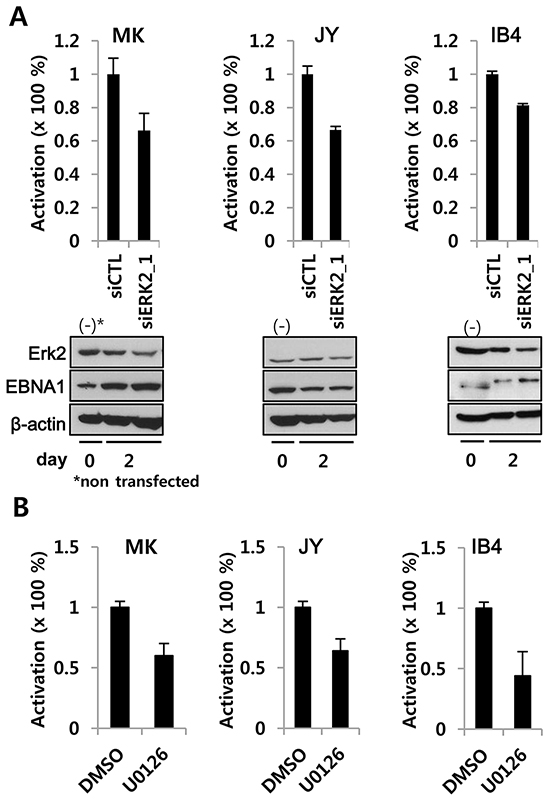 Figure 4: ERK2 depletion or inhibition decreases EBNA1-dependent transactivation activity in EBV-transformed LCL. A. siRNA-mediated transient knockdown of ERK2 in LCL reduced EBNA1-dependent transactivation. EBV-immortalized fresh LCLs (MK, JY) and an old LCL (IB4) were transiently co-transfected with POLP2, EBNA1-independent SV40p-RL along with siCTL (scrambles control siRNA) or siRNA2_1(100 nM) (See Figure 3). B. LCLs transiently transfected with POLP2 and SV40p-RL were divided in two aliquots, treated for 2 days with U0126 (10 μM) or DMSO, and subjected to reporter assay. In A and B, EBNA1-specific firefly luciferase was normalized to EBNA1-independent RL. SiERK2 and U0126 activities were compared to the normalized activity in siCTL or DMSO treated cells, where it was set to 100%.