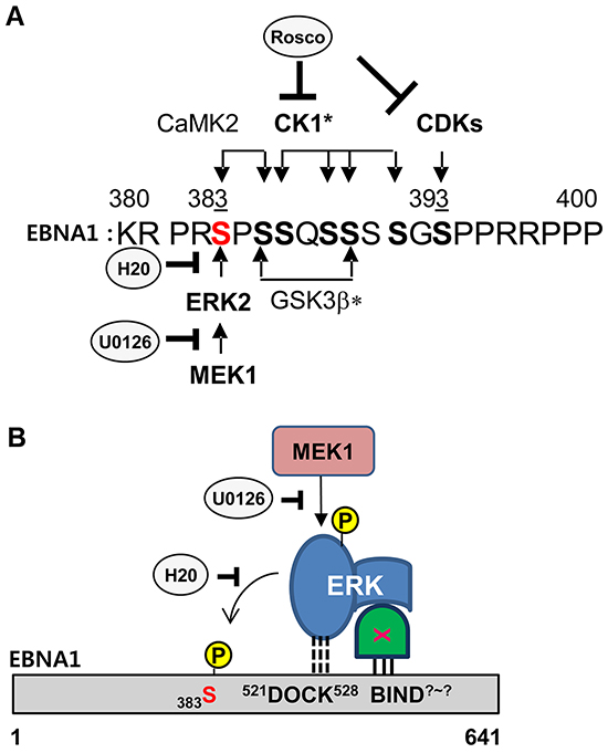 Figure 5: Model of ERK2-EBNA1 interaction. A. Schematic diagram of putative phosphorylation cascades in EBNA1 a.a. 380-400. Consensus sites and comments for indicated kinase are as follows: ERK2 (PxS/TP or xxS/TP, CaMK II (RxxS/T), CDK1 (S/TPxR/K), CK1* (SxxS/T), GSK3b* (SxxxS), bold S/T (phosphorylation site), underlined S (prior phosphorylation site needed for subsequent phosphorylation at bold S), *cascade (prior phosphorylation)-dependent phosphorylation. B. Model of EBNA1-ERK2 interaction. A putative ERK docking motif (521DOCK528) on EBNA1 mediates a direct interaction with ERK2 and phosphorylation at S383 but is dispensable for in vivo interaction. An unknown protein linker (X) likely mediates ERK2 and EBNA1 interaction in vivo through an unknown site (BIND?-?) on EBNA1.