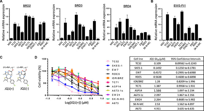 Figure 1: Ewing Sarcoma cell lines overexpress BRD2, BRD3, BRD4 and EWS-Fli1 at mRNAs level and are sensitive to BET proteins inhibition. (A) Expression of BRD2, BRD3, BRD4 and (B) EWS-Fli1 at mRNA levels was evaluated by qRT–PCR in human Ewing Sarcoma cell lines compared with human mesenchymal stem cells (MSCs). GAPDH and B2M are used as housekeeping genes. Error bars show standard deviation for n = 3 measurements from representative experiments. (C) Chemical structure of the two JQ1 enantiomers. (D) Human Ewing Sarcoma cell lines (A673, A673-1c, ASP14, EW7, EW24, IOR/BRZ, RDES, SKES-1, SK-N-MC, TC32 and TC71) were cultured for 48 hours in the presence of JQ1(+) at the indicated concentrations and cell growth was determined by WST-1 assay and compared with control (left panel). GI50 for JQ1(+) in tumor cell lines (right panel). These experiments were repeated at least twice. Error bars show standard deviation for n = 3 measurements from representative experiments.