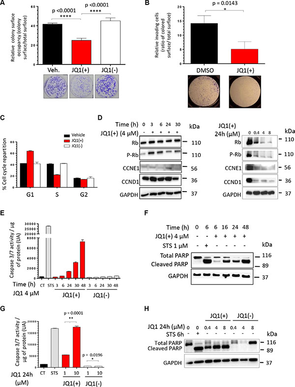 Figure 2: JQ1 inhibits the clonogenicity, the migratory potential and induces both a G1-phase cell cycle arrest and the apoptosis of human Ewing Sarcoma cell lines. (A) The TC71 Ewing Sarcoma cell line was plated at clonal density for colony numeration and treated with 4 μM JQ1(+) for 48 hours. Colony number was counted thanks to crystal violet staining performed after a 6-days incubation time and pictures of representative wells were taken. These experiments were repeated at least twice. Error bars shows standard deviation for n = 3 measurements from representative experiments. A two-tailed paired Student’s t-test was used to compare the different conditions in the clonogenic assays. (B) The TC71 cells were cultured or not in presence of 4 μM JQ1(+) during 24 hours and were then plated in Boyden Chambers, always in presence of JQ1(+) for additional 48 hours. Error bars show the standard deviation for n = 8 measurements from representative experiments and a two-tailed paired Student’s t-test was used to compare the different conditions. (C) The TC71 Ewing Sarcoma cell line was treated with 1 μM JQ1(+) for 48 hours and the proportion of cells in G1, S, and G2 phase was determined by propidium iodide staining. (D) The TC71 Ewing Sarcoma cell line was treated with 4 μM JQ1(+) for 3, 6, 24 or 30 hours and the cell cycle-related proteins Rb, phosphorylated-Rb, CCNE1and CCND1 expression levels were evaluated by Western blotting (left panel). The expression of the same proteins was assessed after treating or not the cells with JQ1(+) at 0.4, 4 or 8 μM during twenty-four hours (right panel). (E) TC71 cells were treated with 4 μM of JQ1(+) or JQ1(–) for 3, 6, 24, 30 or 48 hours, and the apoptosis was evaluated by dosage of the caspase 3/7 activities. (F) The TC71 cell line was treated with 4 μM JQ1(+) for 6, 16, 24 or 48 hours and apoptosis was evaluated by cleaved poly (ADP-ribose) polymerase (PARP) level by Western blotting. (G) The apoptosis was evaluated by dosage of the caspase 3/7 activity in the TC71 Ewing Sarcoma cell line after JQ1(+) or JQ1(–) treatment at 1 or 10 μM during 24 hours. (H) The same cell line was treated with 0.4, 4 or 8 μM JQ1(+) or JQ1(–) for 24 hours and apoptosis was evaluated by cleaved poly (ADP-ribose) polymerase (PARP) level by Western blotting. For all the Western blotting experiments, the Glyceraldehyde-3-phosphate dehydrogenase was used as a loading control. These experiments were repeated at least twice. For the caspase 3/7 activity assays, error bars shows standard deviation for n = 3 measurements from representative experiments. A two-tailed paired Student’s t-test was used to compare the different conditions in these assays. For all the apoptosis assessment assays, a 6 hours Staurosporine (STS) treatment at 1 μM is used as a positive control.