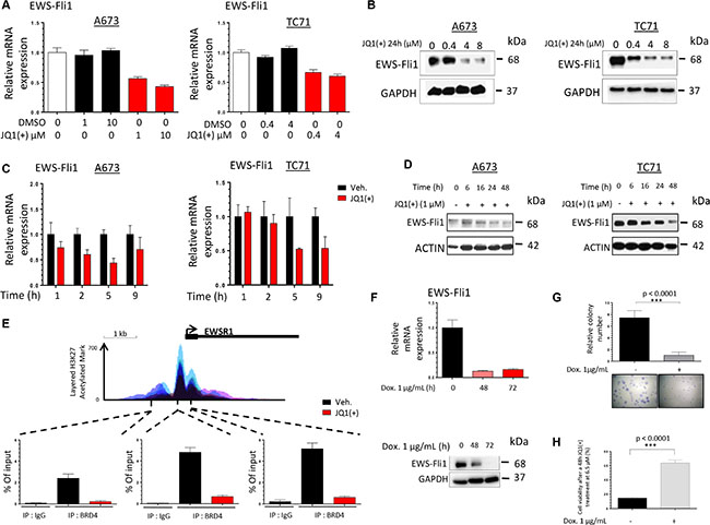 In order to demonstrate that EWS-Fli1 is the key mediator of the JQ1(+) functional effects observed in Ewing Sarcoma cells, we performed experiments using the doxycycline-inducible shEWS-Fli1 ASP14 cell line. We first confirmed the clonogenic-promoting effect of EWS-Fli1 in our model, highlighting the fact that suppressing EWS-Fli1 expression mimics the BET bromodomains inhibition effects on the Ewing Sarcoma cells clonogenic capabilities (Figure 3F, 3G). In order to check the crucial implication of EWS-Fli1 in the JQ1(+) response, we then assessed the cellular viability of the same cells after a JQ1(+) treatment, expressing or not EWS-Fli1 (Figure 3H). Our results show that under-expressing EWS-Fli1 significantly reduces the sensitivity to a forty-eight hours JQ1(+) treatment at 6.5 μM. Taken together, those data emphasise and support the BET bromodomains implication in the EWS-Fli1 expression activation and supports the fact that JQ1 has an EWS-Fli1-dependent activity in our model.