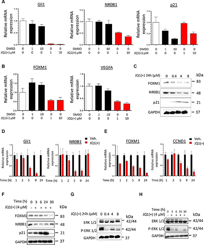 Figure 4: JQ1(+) treatment in Ewing Sarcoma cells induces a dose- and a time-dependent modulation of pathways under the control of EWS-Fli1. (A) qRT–PCR for EWS-Fli1 direct-target genes (Gli1, NR0B1 and p21) and (B) EWS-Fli1indirect-target genes (FOXM1 and VEGFA) in DMSO or JQ1(+)-treated Ewing Sarcoma A673 cell line during 24 h, at 1 and 10μM JQ1(+). (C) FOXM1-, NR0B1- and p21-EWS-Fli1-target gene expression was evaluated at protein level by Immunoblotting in the A673 Ewing Sarcoma cell line after JQ1(+) treatment at 0.4, 4 or 8 μM during 24 h. Glyceraldehyde-3-phosphate dehydrogenase was used as a loading control. (D) qRT–PCR for EWS-Fli1 direct target genes (Gli1and NR0B1) and (E) EWS-Fli1 indirect-target genes (FOXM1 and CCND1) in DMSO (Veh.) or JQ1- (+)-treated Ewing Sarcoma A673 cells at 4 μM during 1, 2, 5, 9 and 24 hours. (F) FOXM1-, NR0B1- and p21-EWS-Fli1-target gene expression was evaluated at protein level by Immunoblotting in the A673 Ewing Sarcoma cell line after JQ1(+) treatment or not during 3, 6, 24, or 30 hours. (G) ERK ½ phosphorylation level was evaluated by Immunoblotting in the A673 Ewing Sarcoma cell line after a 24 hours JQ1(+) treatment at 0.4, 4 or 8 μM or after a 4 μM JQ1(+) treatment during 3, 6, 24, or 30 hours (H). All the Western blots were performed at least twice and representative blots are presented. Glyceraldehyde-3-phosphate dehydrogenase was used as a loading control. For all the qRT-PCR, GAPDH and B2M are used as housekeeping genes and error bars show standard deviation for n = 3 measurements from representative experiments.