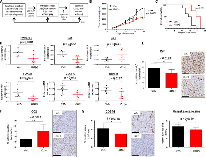 Figure 5: JQ1(+) significantly delays tumor growth in TC71 xenograft model and prolongs cancer-specific survival. (A) Experimental design: 1.5 million TC71 Ewing Sarcoma cells were injected paratibially in nude mice. Mice were IP injected with 50 mg/kg JQ1(+) or vehicle (10% HP-β-CD) twice a day for the indicated time when tumor volume reached 100 mm3. (B) The mean tumor volume of mice treated was compared with control group ± s.e.m (n = 8 mice in each group).Two-way ANOVA statistical test was used. (C) In Kaplan–Meier curves, cancer-specific survival were compared between mice treated with JQ1(+) and control. The log-rank (Mantel-Cox) test was used to compare the overall survival between groups. (D) EWS-Fli1, Gli1, p21, FOXM1, VEGFA and CCND1 expressions were evaluated in tumor tissues, after RNA extraction, by qRT–PCR. For all the qRT-PCR, GAPDH and B2M are used as housekeeping genes. Unpaired two-tailed t-test was used to compare the gene expression between groups. (E) Tumors were collected at the time of euthanasia and Ki67 was evaluated by immunohistochemical analysis (original magnification, 200; scale bar, 100 μm). (F) Tumors were collected at the time of euthanasia and caspase 3 activity was evaluated by immunohistochemical analysis (original magnification, 50; scale bar, 250 μm). (G) Tumors were collected at the time of euthanasia and CD146 staining was performed by immunohistochemical analysis (left panel). The size of vessels (right panel) was also calculated thanks to the Image J software. For each mouse, ten pictures were taken and were scored and estimated in % of positive cells ± s.d. for DAB activity, in the delimited region of interest (ROI) within the tumor. Error bars show s.d. for n = 80 pictures.