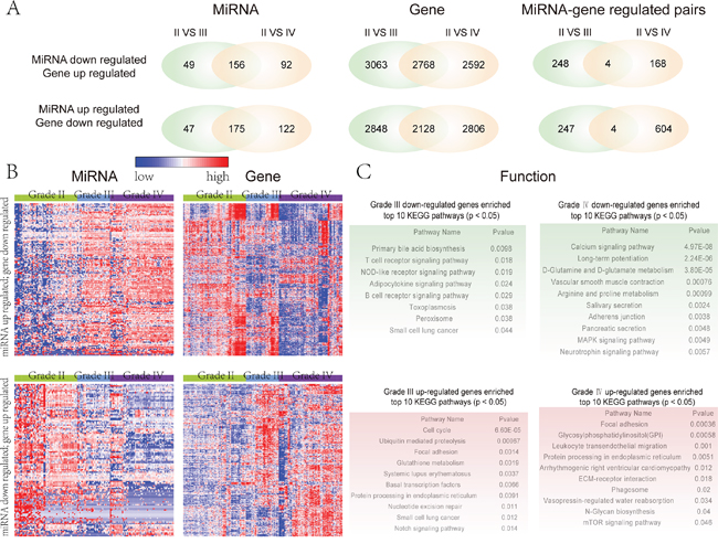Figure 1: Global view of the glioma malignant progression related miRNAs and genes. A. The left panel is the venn plot of glioma malignant progression related miRNAs by comparing low grade with high grade and GBM glioma respectively. The middle panel is the venn plot of glioma malignant progression related genes by comparing low grade with high grade and GBM glioma respectively. The right panel is the venn plot of relationships between the miRNAs and target genes that associated with the progression of glioma. B. The expression pattern of glioma malignant progression associated miRNAs and their target genes. The expression pattern of miRNAs and their target genes were obtained by using one-dimensional hierarchical cluster. The up (bottom) panel is the expression pattern of the up-regulated (down-regulated) miRNAs and their down-regulated (up-regulated) target genes when comparing the grade II glioma samples with grade III and grade IV glioma samples. C. Pathway enrichment analysis of four sets of target genes, indicating the functional roles of their regulated miRNA sets in different glioma progression stage. Red color corresponds to up-regulated genes and green color corresponds to down-regulated genes.
