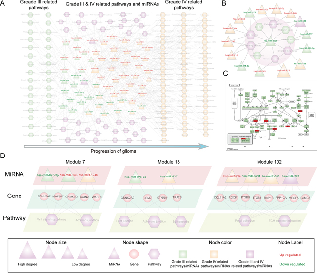 For each glioma-associated miRNA, we first identified its crosstalk pathways via its inversely correlated target genes (see Methods). The significant miRNA-pathway relationships (P < 0.05) were retained to construct the glioma malignant progression associated miRNA-pathway crosstalk network. In total, 21 down-regulated miRNAs, 39 up-regulated miRNAs, and 142 KEGG pathways are involved in the network (Figure 2A). Among these KEGG 142 pathways, 33 pathways are uniquely associated with grade III glioma, while up to 70 pathways are uniquely associated with grade IV glioma; 39 pathways are associated with both grades of glioma. These data suggest that there are broader dysregulation biological pathways in the high-grade (grade IV) glioma. Moreover, there are many glioma and tumor related miRNA-regulated pathways in the networks, such as ‘glioma’, ‘apoptosis’, ‘Wnt signaling pathway’, ‘MAPK signaling pathway’, ‘cell cycle’, ‘focal adhesion’, ‘p53 signaling pathway’ and ‘mTOR signaling pathway’.