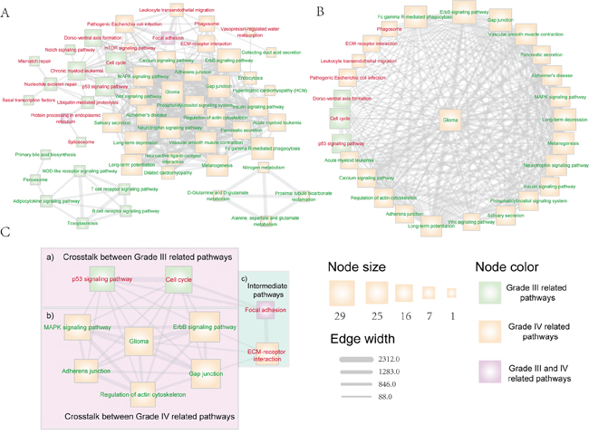 Figure 3: The dysfunctional pathway crosstalk network that associated with glioma malignant progression. Pathways that enriched by up-regulated (down-regulated) target genes were marked with red (green) node label. Pathways that uniquely related with grade III (IV) glioma were marked with green (yellow) node fill color, while pathways that related with both grade III and grade IV glioma were marked with purple node fill color.Edge-line width is proportional to the dysfunctional crosstalk score of two pathways. Node size is proportional to their degree in the overall dysfunctional pathway crosstalk network. A. The overall dysfunctional pathway crosstalk network that associated with glioma malignant progression. B. Dysfunctional pathways that directly crosstalk with the glioma pathway. C. The core dysfunctional crosstalk module that related with glioma malignant progression, in which two pathway crosstalk routes were included to promote the progression of glioma: (i) direct pathway crosstalk within module between grade III and grade IV related pathways (region a&b); (ii) indirect interactions through pathways not included in module (region c).