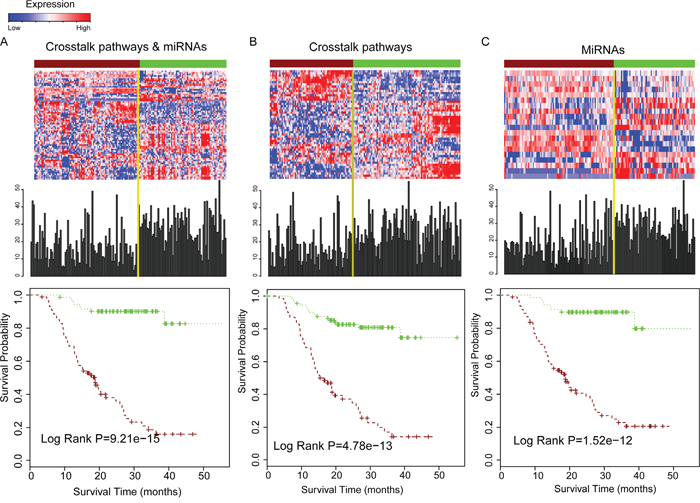 Figure 4: Combination of pathway crosstalk information and miRNA can gain the power for predicting survival of glioma patients. A. Combination of crosstalk pathways of core module in Figure 3C and miRNAs for prediction the survival of overall glioma patients. The upper panel is the expression pattern of genes and miRNAs for predicting survival and the survival time distribution of all the glioma samples. The bottom panel is the estimates of survival of glioma samples based on signature genes of pathways that involved in the core module in Figure 3C and miRNAs that regulated them. B. Only signature genes involved in the crosstalk pathway module used for estimating patient survival. C. Only signature miRNAs which regulated these crosstalk pathways used for estimating patient survival.
