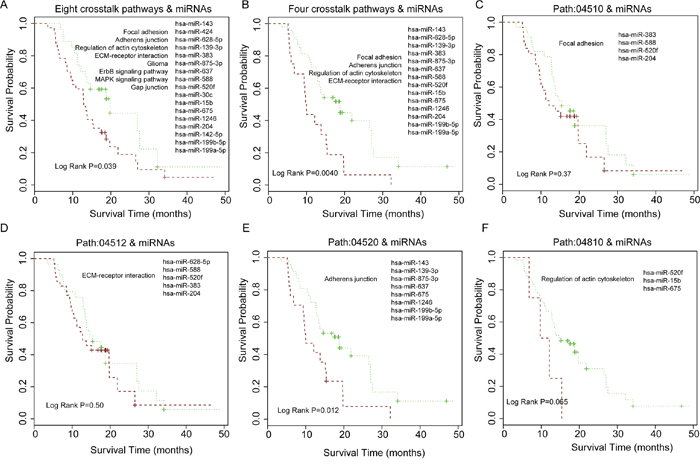 GBM (grade IV glioma) is the most common and aggressive brain tumor, which is usually associated with poor prognosis (short survival time) [41]. We used signature genes involved in the 8 grade IV crosstalk pathways of the core module in Figure 3C and signature miRNAs that regulate them to perform the survival analysis. In total, 43 genes and 17 miRNAs were selected for the survival analysis of GBM patients. The P-value was 0.039 for the shorter survival time and long survival time group (Figure 5A). Since pathways that participate in the cell communication, such as focal adhesion are associated with malignant phenotype [34], we selected four crosstalk pathways including focal adhesion, ECM-receptor interaction, regulation of actin cytoskeleton and adherens junction, which were included in the core module and associated with grade IV glioma. In total, twenty-five genes and 14 miRNAs were used and the P-value was 0.0040 between the short and long survival group in the progression-free samples (Grade IV) (Figure 5B). We then examined whether the pathway crosstalk information can contribute to the power of survival prediction. We used only one of these four crosstalk pathways and miRNAs to predict the patient survival respectively. The results show that only one pathway and the related miRNAs could stratify the GBM patients into different survival prognosis (Figure 5C–5F), indicating that pathway crosstalk can improve survival prediction.