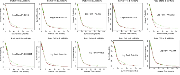 We further examined the ability of pathway crosstalk information to predict clinical outcomes of glioma patients. We separately applied gene signatures that involved these 10 core crosstalk pathways and their related miRNAs to predict the survival of glioma samples in TCGA independent dataset. The results show that up to 9 of these 10 core crosstalk pathways exhibit lower power for prediction of clinical outcome of glioma patients by using only single pathway (Figure 7) compared with that of using pathway crosstalk information. One pathway (Path: 04510) has a lower p-value (log rank P= 0.00023, Figure 7) compared with pathway crosstalk information (log rank P= 0.00034, Figure 6A). Furthermore, almost all of these pathways have log rank P-value > 0.1 (Figure 7). In summary, our results show that the combination of pathway crosstalk information and related miRNAs can improve the power of prediction of clinical outcome in the independent datasets.