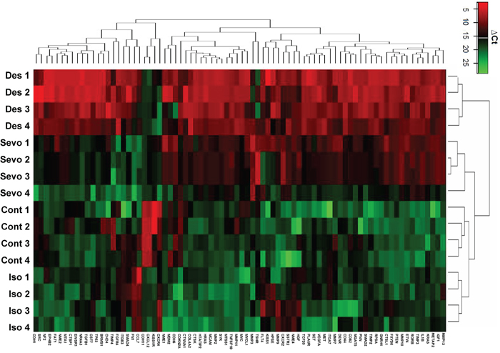 Figure 1: Isoflurane, Sevoflurane and Desflurane alter mRNA expression levels of tumour metastasis genes shown by array analysis. SK-OV3 cells were treated with air (N2) or 2% Isoflurane (Iso) or 3.6% sevoflurane or 10.3% Desflurane for 2 hours, and then recovered in the normal cell incubator for up to 24 hours. Six hours after exposure analysis of the tumour metastasis PCR array was carried out. Unsupervised hierarchical cluster analysis using Euclidean distance from TaqMan low-density arrays. Gas treatment induced changes in the expression of 70 out of 81 mRNAs relative to the controls and, in comparison to sevoflurane and isoflurane, desflurane led to greater increases in mRNA (N=4). All data is relative to endogenous control, β-Actin. Red and green colours indicate relatively high and low expression, respectively.