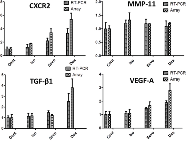 The tumour metastasis PCR array enabled the analysis of 81 mRNAs including 5 endogenous control candidates after 6 hours of gas exposure (Figure 1). All three gases induced changes in the mRNA expression level of 70 out of 81 mRNAs (Table 1), but different inhalational anaesthetics had distinct effects on changes in the gene expression profile (Table 2). In particular, changes induced by desflurane were different to those seen with exposure to isoflurane and sevoflurane (Figure 1), with desflurane leading to greater increases in mRNA. In order to validate these array results, qRT-PCR was performed on a proportion of the 81 mRNAs in the array analysis (Figure 2). The array analysis and the qRT-PCR results are well correlated. For example; VEGF-A mRNA expressions seen with qRT-PCR were 1.00 ± 0.23 (control), 1.10 ± 0.14 (isoflurane), 1.47 ± 0.07 (sevoflurane) and 1.89 ± 0.13 (desflurane), and those from array analysis were 1.00 ± 0.21 (control), 1.09 ± 0.29 (isoflurane), 1.66 ± 0.28 (sevoflurane) and 2.78 ± 0.49 (desflurane) relative to the control. In addition, this analysis revealed that four of the mRNA (CXCR2, TGF-β, VEGF-A and MMP11) were significantly up-regulated and thus they were chosen for further investigation of protein expression.