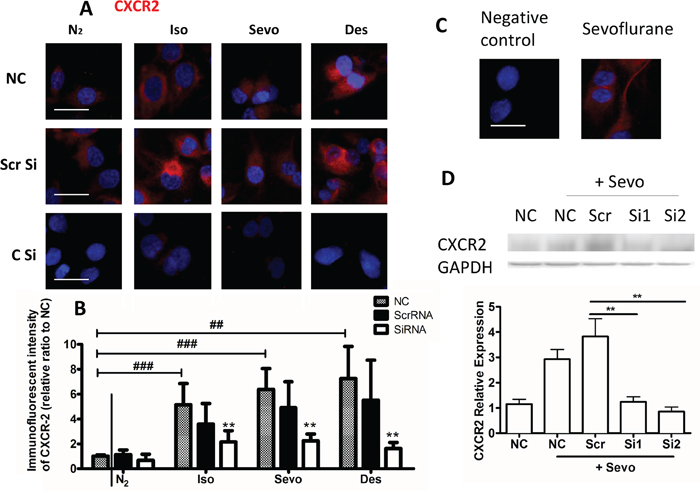 Cells were seeded in 6-well plates at 60-80% confluency, allowed to settle for 24 hours and then transfected with scrambled siRNA (ScrRNA) or two different CXCR2 siRNA constructs (siRNA1: Sense Strand 5’→ 3’- CAGUCAGGAUUUAAGUUUATT; 5’→ 3’- UAAACUUAAAUCCUGACUGGG. siRNA2: 5’→ 3’- CCUCAAGAUUCUAGCUAUATT; 5’→ 3’- UAUAGCUAGAAUCUUGAGGAG) (Qiagen, Crawley, West Sussex, UK) at a concentration of 20nM. The transfection was facilitated with HiPerfect Transfection Reagent (Qiagen). After 6 hours of transfection, the solution was replaced with medium before exposure to test gas mixtures. Then cells treated with siRNA1 or with both siRNA 1 and 2 will be used for in situ immunostaning and western blot respectively (see below).