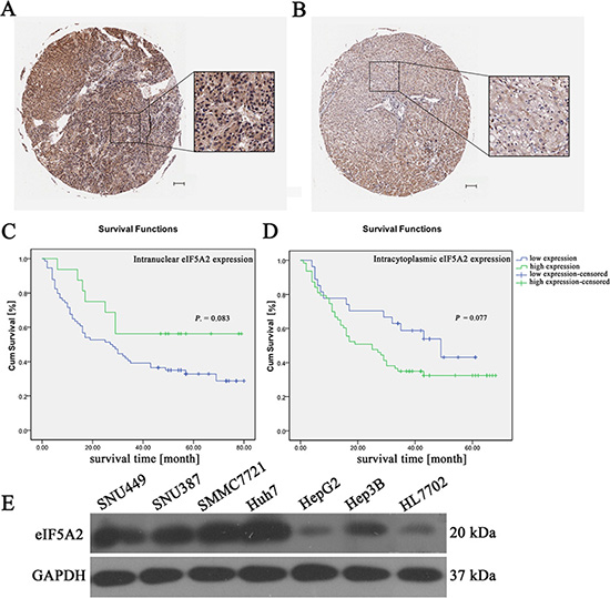 Figure 2: The relationship between eIF5A2 expression and overall survival. (A and B) Representative immunohistochemical images showing the overexpression of eIF5A2 in HCC tissue (A) and its expression in adjacent tissue (B) (scale bars, 100 μm). (C) Kaplan-Meier curves for overall survival time in 90 HCC patients plotted according to their intranuclear expressions of eIF5A2; P = 0.083 by the log-rank test. (D) Kaplan-Meier curves for overall survival rates of 90 HCC patients based on the intracytoplasmic expression of eIF5A2; P = 0.077 by the log-rank test. (E) Western hybridization reflecting the expression of eIF5A2 in six HCC cell lines and normal human liver cells (HL7702).