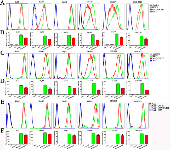 To evaluate the changes in cellular ROS levels after GC7 treatment (50 μM) for 24 h, dichlorodihydro-fluorescein diacetate (DCFH-DA) was used as a probe. The mean fluorescence intensity from flow cytometry revealed that GC7 significantly reduced the intercellular levels of ROS (Figure 3A, 3B). N-acetylcysteine (NAC), a ROS inhibitor, eliminated cellular ROS (Figure 3C, 3D). GC7 did not reduce the intercellular levels of ROS further in the six HCC cell lines treated with 50 μM NAC (Figure 3E, 3F).