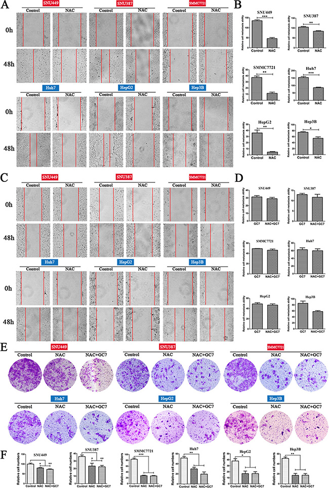 Figure 4: Effects of NAC and NAC plus GC7 on the invasion and metastasis of HCC cells. (A) Wound-closure in the presence or absence of NAC (representative phase-contrast images at 0 and 48 h after creating the wound; magnification 100 ×). (B) Bar graphs based on quantitative data from (A). Data are mean ± SEM. *P < 0.05, **P < 0.01,***P < 0.001 versus control. (C) Wound-closure of cells cultured with NAC (50 μM) in the presence or absence of GC7 (magnification 100 ×). (D) Graphs based on quantitative data from (C). Data are mean ± SEM. (E) Representative photographs of transwell experiments showing that NAC suppressed cell invasion. (F) Bar graphs based on quantitative data from (E). Data are mean ± SEM. *P < 0.05, **P < 0.01,***P < 0.001 versus control. Each experiment was repeated at least three times.