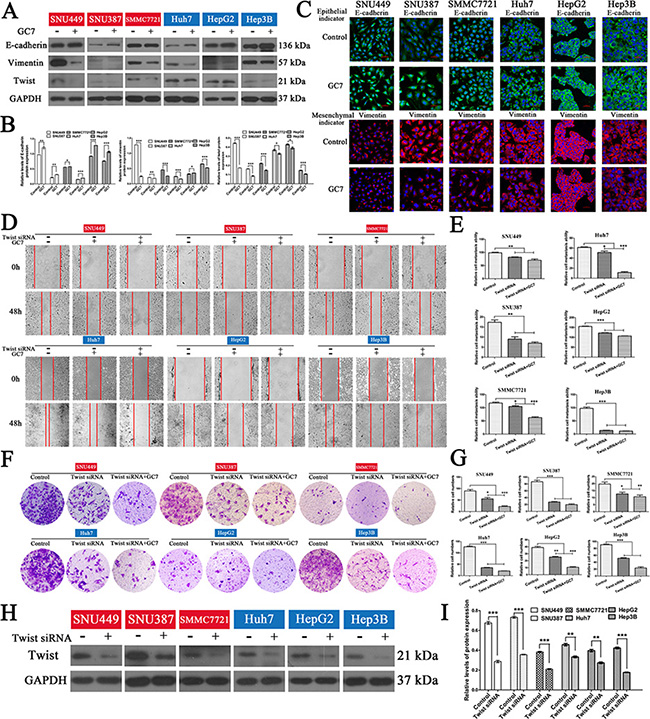 Figure 5: GC7 altered EMT progress and did not inhibit the invasion and migration of HCC cells after blocking the EMT. (A) Expression of E-cadherin, vimentin, and twist in cells were cultured in the presence or absence of GC7 (50 μM) for 24 h. GAPDH served as a loading control. (B) Bar graphs based on quantitative data from (A). Data are mean ± SEM. *P < 0.05, **P < 0.01,***P < 0.001 versus control. (C) Immunofluorescence staining for E-cadherin (green), an epithelial marker, and vimentin (red), a mesenchymal marker, in six HCC cell lines cultured in the presence or absence of GC7 for 24 h. Nuclei were counterstained with DAPI. Scale bars, 50 μm. (D) Representative photographs of wound-healing assays at 0 and 48 h after creating a wound (magnification 100 ×). Cells were divided into three groups: control, GC7, and GC7 plus twist siRNA transfection. (E) Bar graphs based on quantitative data from (D). Data are mean ± SEM. *P < 0.05, **P < 0.01,***P < 0.001 versus control. (F) Representative photographs of crystal violet-stained cells after twist siRNA transfection in the presence or absence of GC7 for 48 h in transwell experiments (magnification 100 ×). (G) Bar graphs based on quantitative data from (F). Data are mean ± SEM. *P < 0.05, **P < 0.01,***P < 0.001 versus control. (H) Western hybridization confirmed the effect of twist siRNA transfection. (I) Bar graphs based on quantitative data from (H). Data are mean ± SEM. *P < 0.05, **P < 0.01,***P < 0.001 versus control. Each experiment was repeated at least three times.