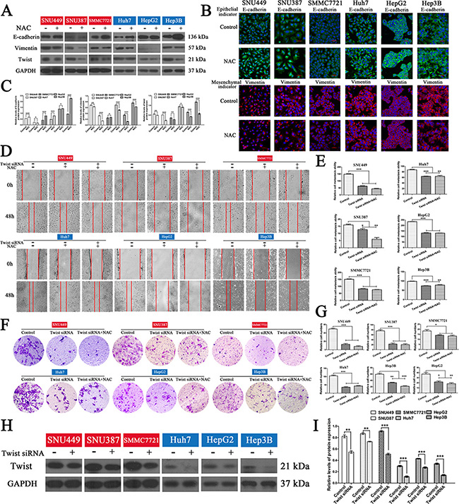Figure 6: NAC reversed the EMT in HCC cells and the inhibitory effects on invasion and migration of HCC cells were reduced after blocking the EMT. (A) Western blotting and (B) inverted confocal microscopic images (scale bars, 50 μm) showing the expression of E-cadherin (epithelial marker: green) and vimentin (mesenchymal marker: red) in HCC cells. Nuclei were counterstained with DAPI. (C) Bar graphs based on quantitative data from (A). Data are mean ± SEM. *P < 0.05, **P < 0.01,***P < 0.001 versus control. (D) Wound-closure control, NAC, and NAC plus twist siRNA transfection groups. Representative photographs at 0 and 48 h after creating a wound (magnification 100 ×). (E) Bar graphs based on quantitative data from (D). Data are mean ± SEM. *P < 0.05, **P < 0.01, ***P < 0.001 versus control. (F) Transwell chambers were used to determine the invasion of cells after twist siRNA transfection in the presence or absence of NAC for 48 h (representative photographs, magnification 100 ×). (G) Bar graphs based on quantitative data from (F). Data are mean ± SEM. *P < 0.05, **P < 0.01,***P < 0.001 versus control. (H) Western hybridization confirmed the effect of twist siRNA transfection. (I) Bar graphs based on quantitative data from (H). Data are mean ± SEM. *P < 0.05, **P < 0.01,***P < 0.001 versus control. Each experiment was repeated at least three times.