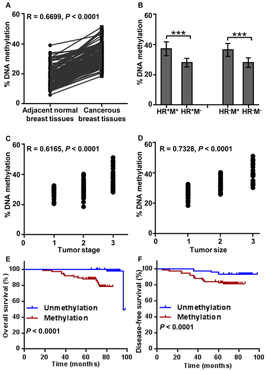 Figure 2: Analysis of BRCA1 promoter methylation levels’ correlations. Figure 2 A, B Analysis of BRCA1 promoter methylation levels in breast cancers and matched normal breast tissue. A. Cancer tissues showed significantly higher levels of BRCA1 promoter methylation (mean 32.6%; median 31.9%) than the adjacent normal samples (mean 16.2%; median 13%) (P < 0.0001). B. Mean level of methylation in 4 CpG sites of the promoter region of BRCA1 in hormone receptor (HR)-positive tumors were 1.33-fold (P < 0.0001) as compared with HR-positive unmethylated tumors, and the mean level of HR-negative methylation tumors were 1.30-fold (P < 0.0001) as compared with HR-negative unmethylated tumors. There was a significant correlation among BRCA1 methylation level and tumor stage C. and also tumor size (P < 0.0001) D. Patients with unmethylated BRCA1 promoter had better overall survival, comparing with methylated BRCA1 promoter using Kaplan–Meier method (98 months, P < 0.0001) E. Unmethylated cancer patients also had longer disease free intervals when compared to the methylated group (98 months, P < 0.0001) F.