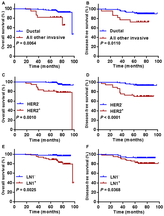 Overall survival and disease free survival vs. pathological type, HER2 status, lymph node status, tumor grade, stage, size and subtype