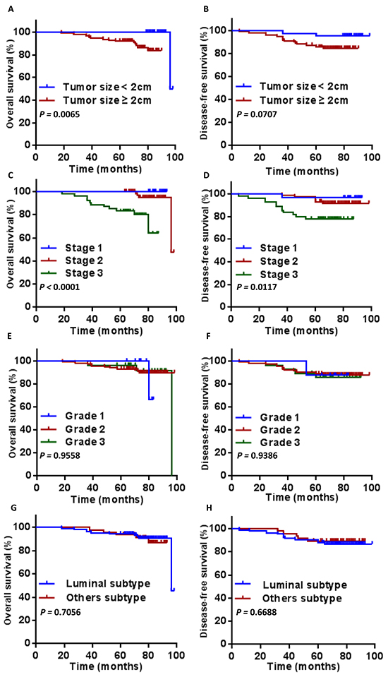 Figure 4: Overall survival and disease free survival according to tumor size A. and B. tumor stage C. and D. tumor grade E. and F. and subtype G. and H. Statistical significance is indicated.