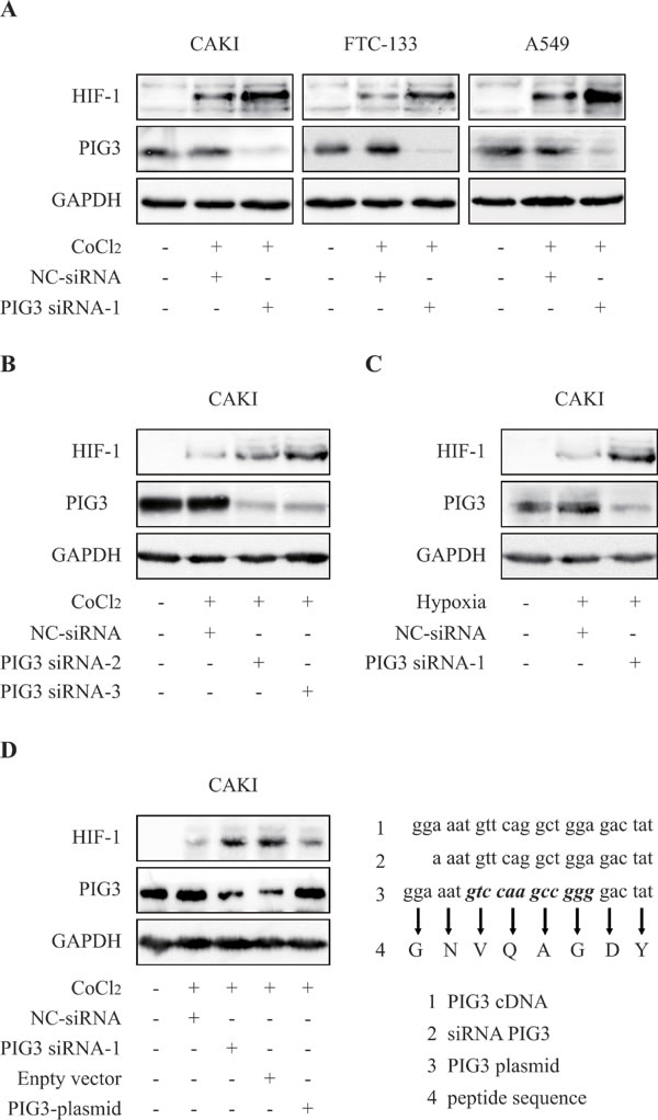 Figure 1: Knockdown of PIG3 up-regulates HIF-1α. A. PIG3 down-regulation mediated by siRNA-transfection significantly increased HIF-1α protein level in CAKI, FTC-133 and A549 cells. Cells were transfected with PIG3-siRNA or negative control siRNA for 48 h before CoCl2-induced hypoxia treatment. B., treatments with both PIG3 siRNA-2 and PIG3 siRNA-3 led to HIF-1α increase in CAKI cells under CoCl2-induced hypoxia-mimic system for 6 hours. C., HIF-1α in PIG3 siRNA-1-transfected CAKI cells also increased under hypoxia (1% O2) for 6 h. D. Complementation with PIG3 blocked HIF-1α increase induced by PIG3-siRNA . CAKI cells were transfected with the mutant PIG3 plasmid 24 h after PIG3-siRNA treatment. Protein levels were analyzed by Immunoblotting, GAPDH was employed a loading control. All the experiments above were conducted thrice.