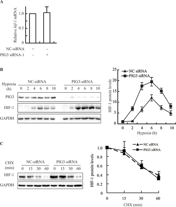Figure 2: Knockdown of PIG3 up-regulates prevents HIF-1α by promoting protein biosynthesis. A., Real-Time PCR analysis showed that PIG3-silencing in CAKI cells did not increase HIF-1α mRNA level. Data shown are fold-change relative to the HIF-1α levels in cells transfected with negative control siRNA (with normalization relative to GAPDH levels). B., Silencing PIG3 in CAKI cells affected the kinetics of the HIF-1α protein when the cells were exposed to hypoxic conditions. C., PIG3 silencing did not affect the degradation of HIF-1α protein under hypoxia. Forty-eight hours after transfection with PIG3-siRNA or negative control siRNA, CAKI cells were pretreated under hypoxia for 4 h followed by treatment with 100 μg/mL cycloheximide (CHX) to block protein synthesis for the indicated times. The mean values from two experiments are connected by the lines. Protein levels were analyzed by Immunoblotting, GAPDH was employed a loading control. All the experiments above were conducted at least twice.