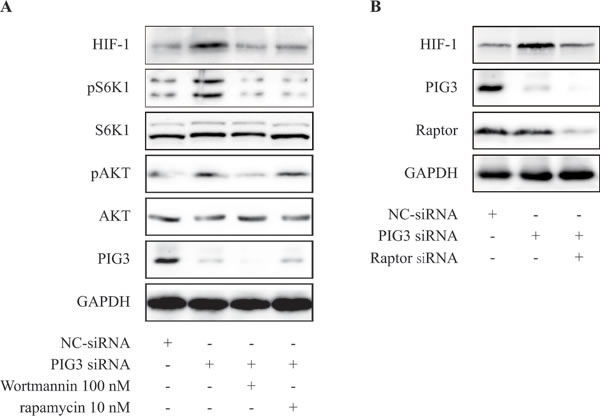 Figure 3: PIG3-silencing promotes the production of HIF-1α via PI3K/mTOR pathway. A. CAKI cells were transfected with PIG3-siRNA for 24 h, then treatment with rapamycin 10 nM for 24 h or wortmannin 100 nM for 8 h before hypoxia treatment. B. CAKI cells were transfected with PIG3-siRNA for 24 h, then treatment with Raptor siRNA for 24 h before hypoxia treatment. All the experiments above were conducted thrice.
