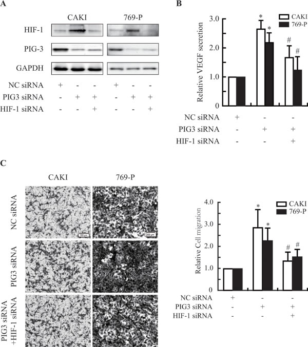 Figure 4: PIG3-silencing promotes the secretion of VEGF and the migration of CAKI and 769-P cells. A., Knocking down PIG3 and/or HIF-1α by transfecting with siRNA. B., ELISA assays showed that down-regulation of PIG3 led to an increase in the secretion of VEGF via HIF-1α in CAKI and 769-P cells exposed to hypoxia for 12 h. C., PIG3-silencing promoted CAKI and 769-P cells migration by targeting HIF-1α. All the experiments above were conducted thrice. Columns indicate the mean of three experiments; Bars, S.D.