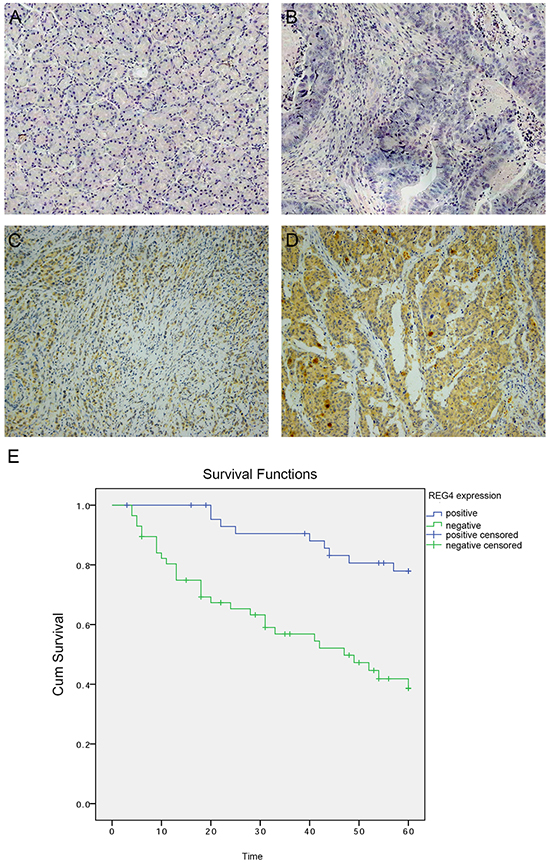 Figure 1: Expression of REG4 in clinical gastric cancer tissues. A. Negative REG4 expression in non-tumor gastric mucosa. B. Negative REG4 expression in gastric cancer. C. Weak positive REG4 expression in gastric cancer. D. Strong positive REG4 expression in gastric cancer. E. Kaplan-Meier survival curve of patients positive and negative for REG4 expression.